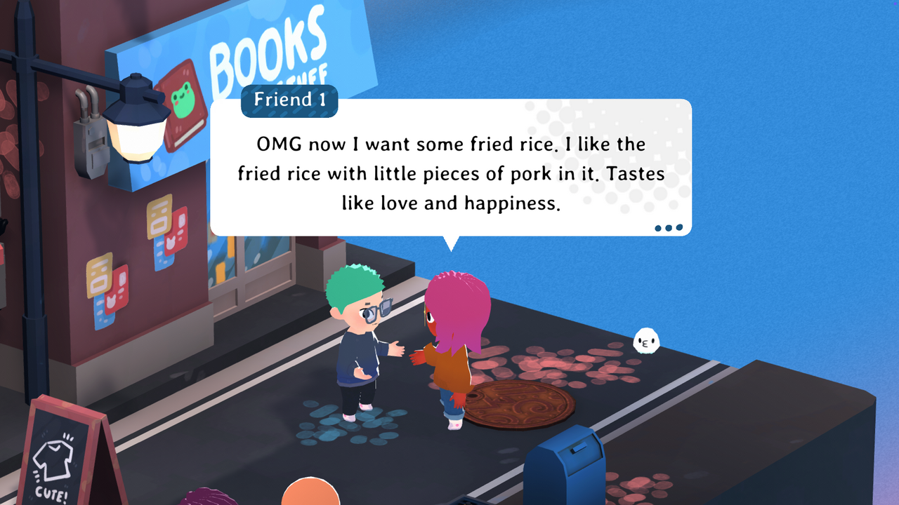 I guess I’m saying there’s something people keep trying to build, and we haven’t quite gotten there yet: maybe a walkable, accessible city full of third places, but inside the computer, allergen-free. Every time a virtual world tries for canniness—by which I mean a lifelike familiarity—now-conventional game mechanics like “foraging” and “crafting” always get in the way. I mean, I love those things, but I mostly login to FFXIV to stand around. Maybe there’s some MMO (with a companion novelty cookbook, I’d hope!) that I would feel more at home in. Kind Words 2 comes darn close. I don’t know. I don’t even like MMOs that much.