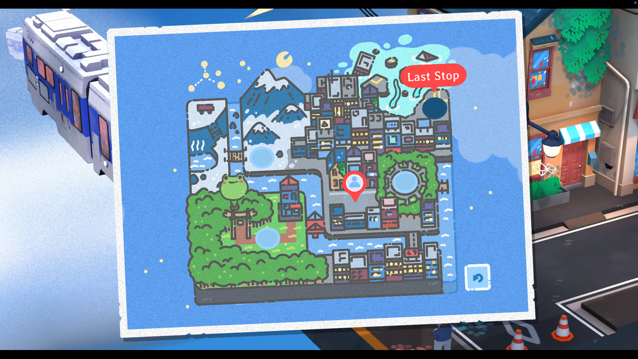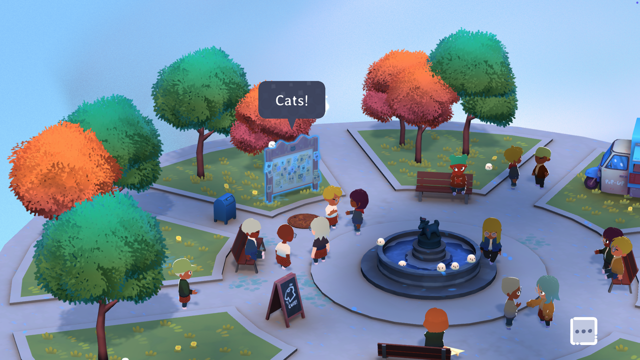 Clicking on the nearby rail stop pulls up the city map, and here is where the magic really happens. From Home, you might naturally choose “Plaza” first. The train deposits you in a park, reminiscent of Wii Plaza, where you can eavesdrop on transcripts of already-completed player Chats. There’s also a hyperspecific bulletin board simply called “Cats!,” where you can either supply a description of a cat, or name the cat based on one of these descriptions, just like T.S. Eliot would do. (Gosh, he is really everywhere.) My cat recently passed away, so I could not look at this for very long.