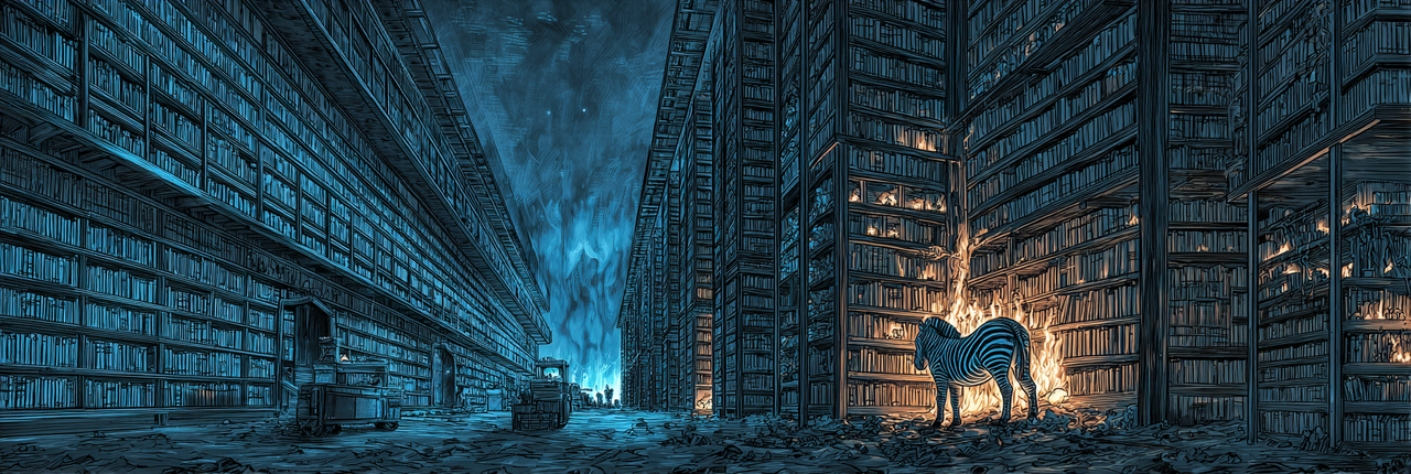 The vacuum is enormous—industrial, heavy metal. I don’t carry it; I drive it, steering it like a truck through the stacks. The machine roars and pulls the flames inward, swallowing heat so the building doesn’t burn. This feels necessary. Routine, even. I know how to do it. Everywhere I look, there are donkeys. Herds of them. They stand calmly, watching. Some of them wear zebra stripes, as though their hides have been rewritten, their identities partially exchanged for pattern.