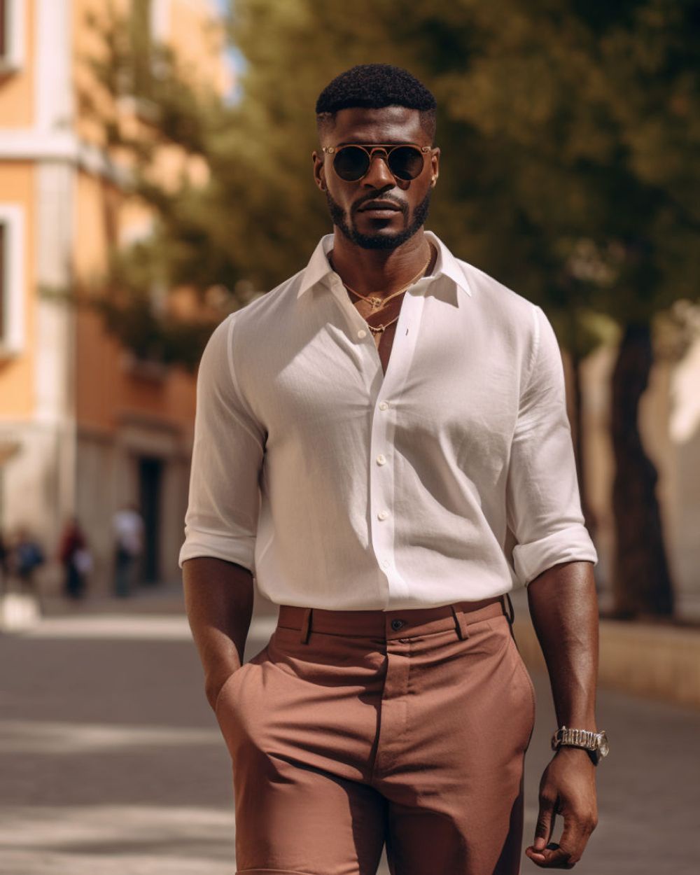 Gents can keep it crisp in chinos and a linen shirt (because we know the guys are reading this too).