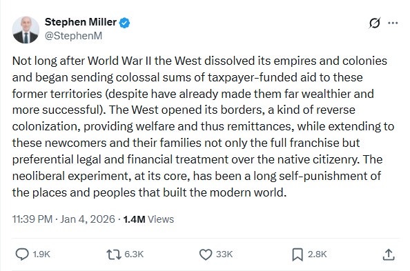 Stephen Miller er en av de mektigste i Trump-administrasjonen. For å forstå USA, må man forstå hva slags skrudd verdenssyn han og andre på toppen av MAGA har. Se for eksempel på dette innlegget fra mandag. Her snus hele USAs moderne historie på hodet.