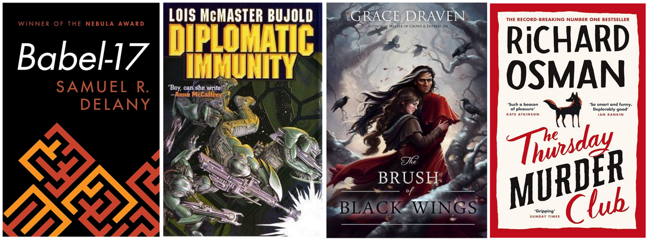 Diplomatic Immunity (Vorkosigan Saga (Publication Order) #13) by Lois McMaster Bujold, 320p: We start with an older Miles and Ekaterin, in their honeymoon, getting into a messy investigation of a man disappearance in the Quaddiespace. Also: scary biological weapons, station lockdowns and mysteries unravelled. We meet again Bel Thorne, former pilot in the Dendarii Free Mercenaries and our favourite hermaphrodite. I liked the contrast of the different cultures: the quaddies focus on work and the Barrayarans focused on honour. The stakes are high, I wasn't prepared for all the tension! Another book with excellent pacing and good climax.