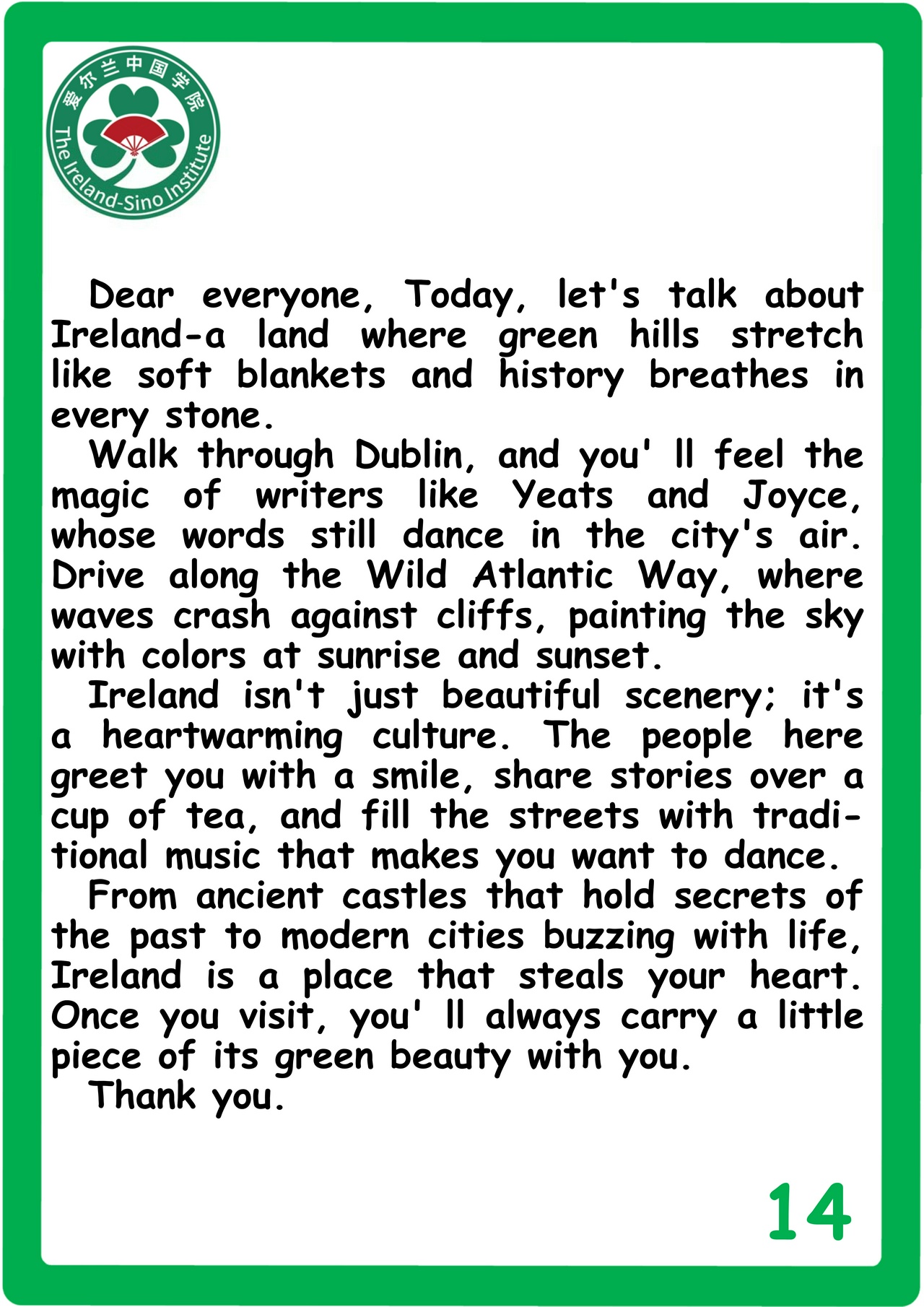 Through the Ireland Sino Institute, we have built libraries, supported teachers, provided learning materials, organised speech festivals, created cultural exchange opportunities, and stood beside communities when they needed it most. I have seen children’s eyes light up as they realise that someone, somewhere in the world, believes in them.