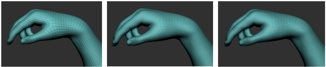 To enable the sculpting of finer details (such as fingernails and sharp creases) additional Subdivision levels were used (see Figure 2). Finally, the model was duplicated and processed with ZRemesher to generate a cleaner topology, which followed the model’s shape better. For the right arm, the previously completed left hand was duplicated and mirrored to ensure the same scale and form. Due to the fact, that the entire forearm was missing, it was constructed separately. After that the hand was positioned into the planned pose and then it was merged with the forearm.