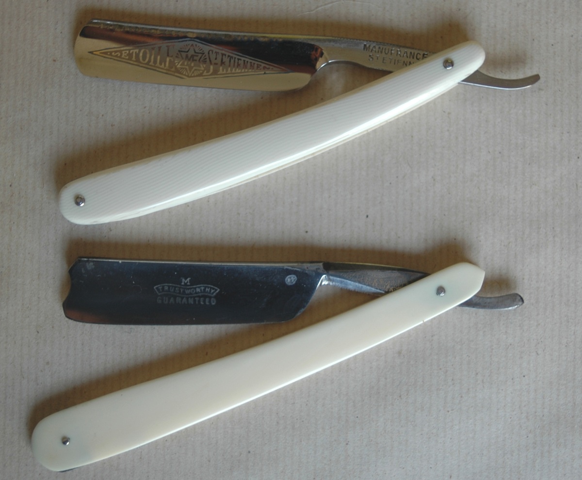One is an early-20th Century full hollow ground razor marked Étoile-St. Étienne on the blade and Manufrance St. Étienne on the tang; while the other is a mid-to-late Victorian razor with a thicker grind, a barber's notch, and the words Trustworthy Guaranteed etched on the blade, with Trustworthy, Mappin & Webb, Royal Cutlery Works… stamped on the tang.