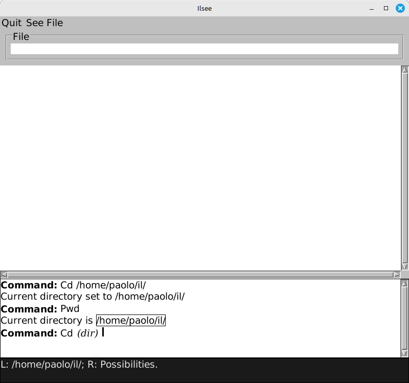 Thanks to the functionality of CLIM presentation types, previously output directories are accepted as input in contexts in which a command expects an argument of matching type. Clicking on a directory fulfills the required argument. In the screenshot the last Cd is prompting for a directory and the outlined, mouse sensitive path /home/paolo/il/ is ready for clicking.