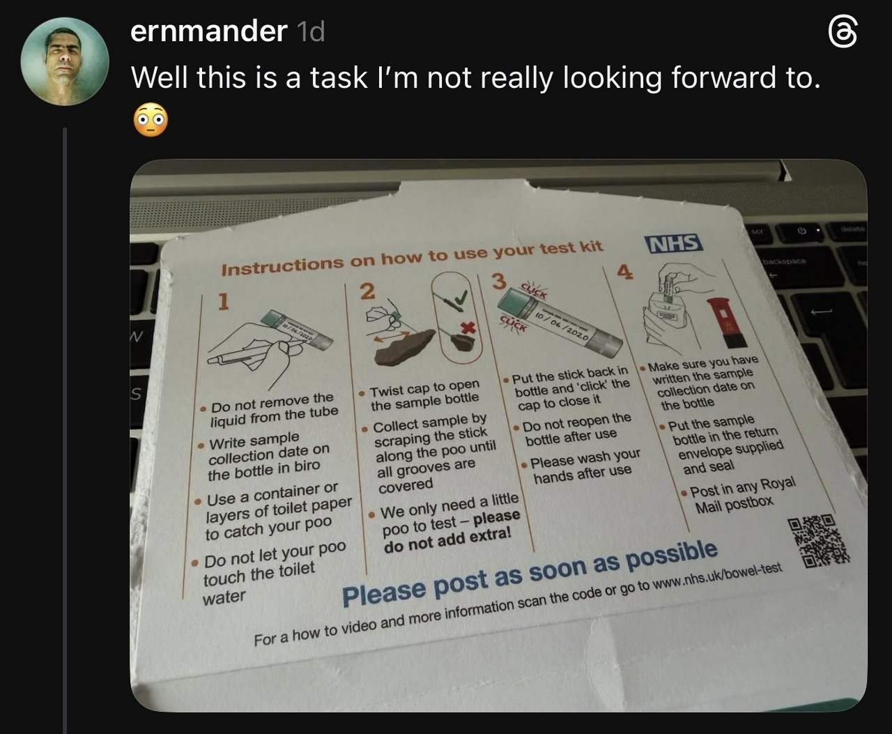I've been sent a cancer screening kit from the NHS. As I say in the post this is not a task I am looking forward to. The post on BlueSky got no response. The post on Mastodon got a couple of replies. The post on Threads though has almost a hundred replies at the time of writing this. It's become almost a support network of people who have also got to do theirs and people who have done it supplying advice.
