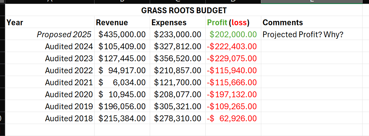 Yet in the latest proposed budget, they projected a revenue of $435,000 and expenses of $233,000. What would justify such a dramatic change in revenue? Considering that revenue has not exceeded $220,000 in the last 7 years…