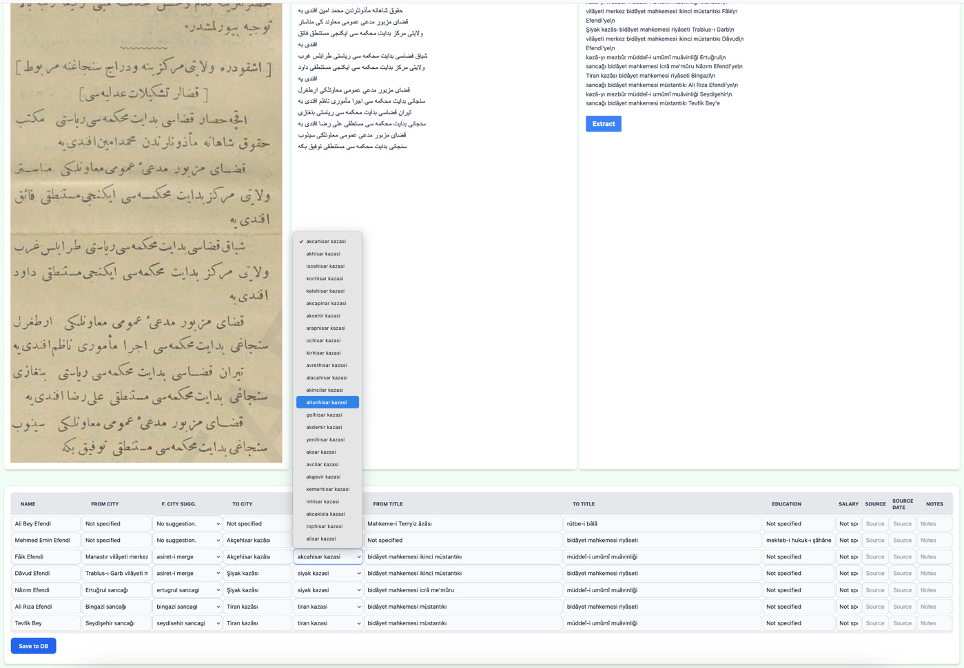 Sol tarafta Ceride-i Mehakim’in atamaları içeren ilgili kısmı. Ortada Arap harfleri, sağ tarafta ise latin harfleri ile çıktısı. Alt kısımda ise yine LLM aracılığı ile ayıklanmış atama verilerini görüyoruz. Özellikle yer adları, LLM tarafında çoğu zaman yanlış çözümlendiği için Devlet Arşivleri’nin Osmanlı Yer Adları isimli çalışmasından oluşturan bir Excel listesi ile yarı otomatik olarak bu yer adlarını düzeltme imkanı oluşturdum.