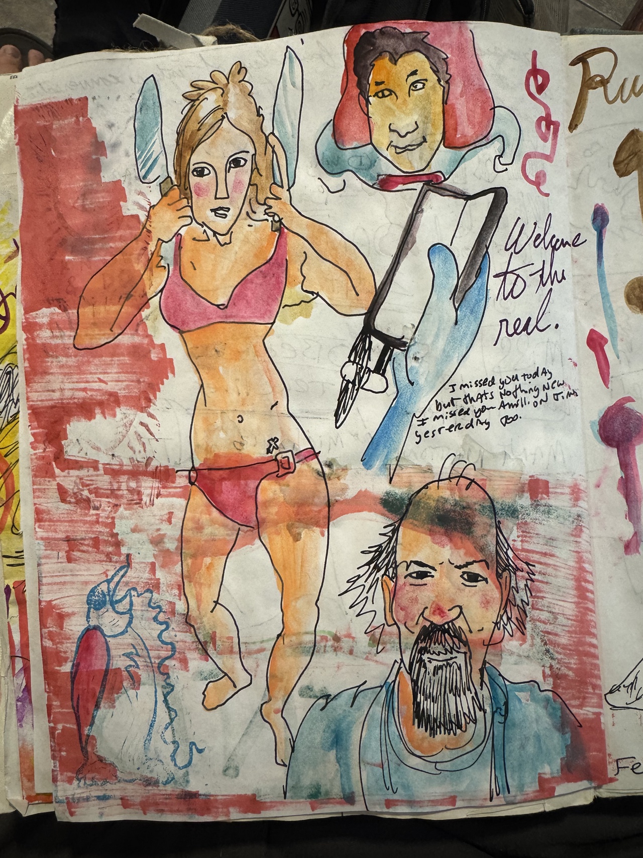 In the journal page I included here, at the bottom is a drawing of the illustrious John Domont. John is an artist who moved to Dust Meridian from Indiana some time ago.